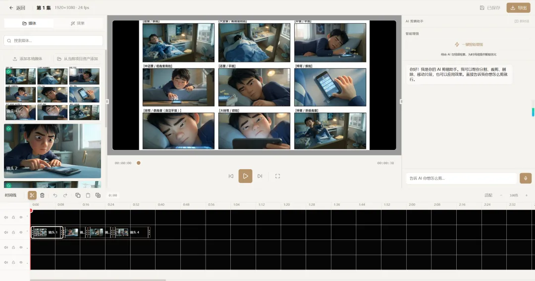 自动剪辑:AI 根据剧本和分镜自动拼接镜头,添加转场特效和背景音乐 -