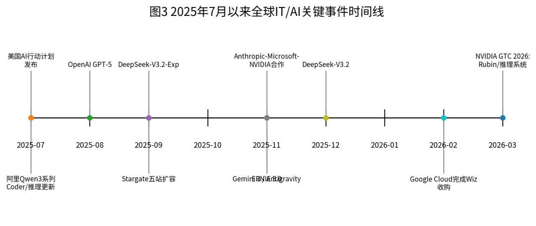 2026年2月至3月:Google完成对Wiz的收购,意图补强云安全与AI时代的多云防护能力;NVIDIA在GTC 2026强化对Rubin、推理系统和Agent生态的叙事,推理基础设施成为资本市场关注焦点。
