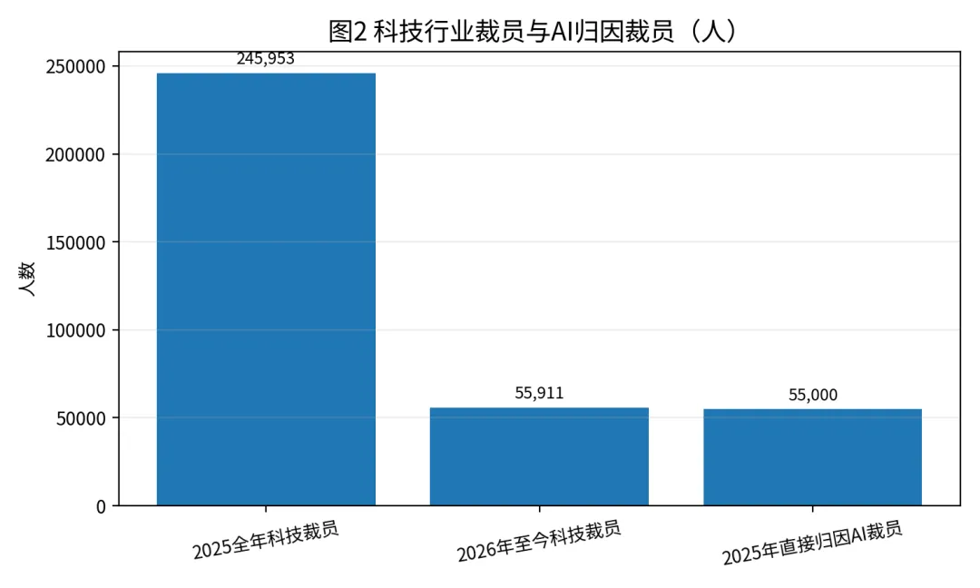 2025年下半年以来,科技行业裁员呈现两个新特征。其一,裁员不再只与宏观经济或疫情后纠偏相关,而越来越多与AI引发的组织重构绑定。TrueUp统计显示,2025年科技行业共有783起裁员、影响245,953人;2026年至今已超过55,900人。CBS援引Challenger, Gray & Christmas的数据称,2025年公司直接将约55,000个岗位裁撤归因于AI,其中约51,000个位于科技行业。