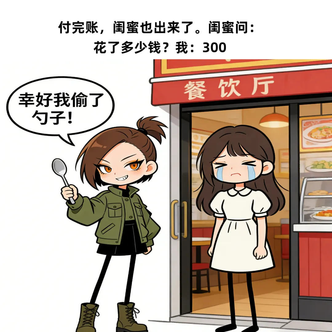 趣味漫画:昨天晚上,闺蜜请我吃饭,快要吃完了,她说:我去趟厕所,我就只好结账了,服务员结账时说:对不起女生,丢了个勺子…