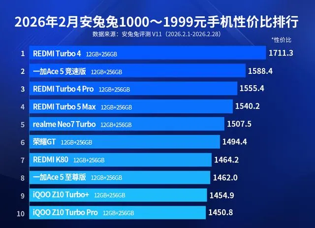 安卓千元机性价比:红米 Turbo5 Max 排第九,第一名分析