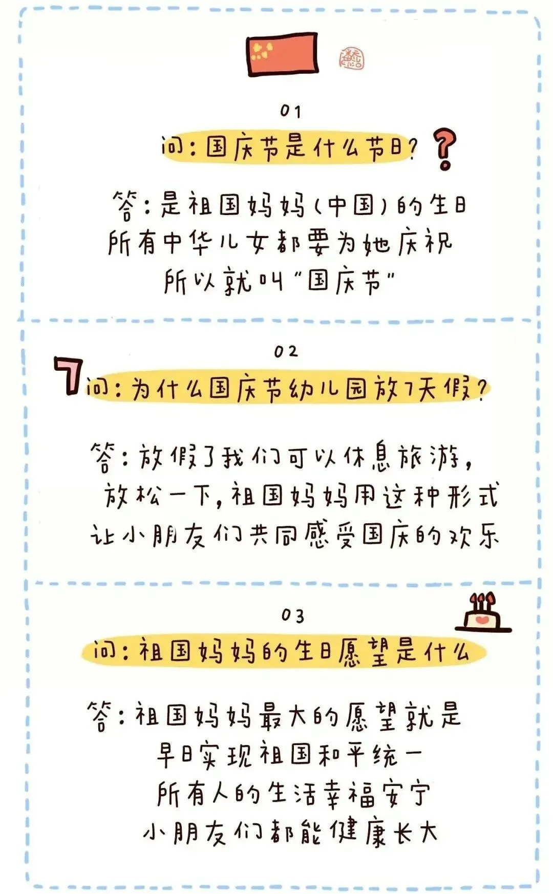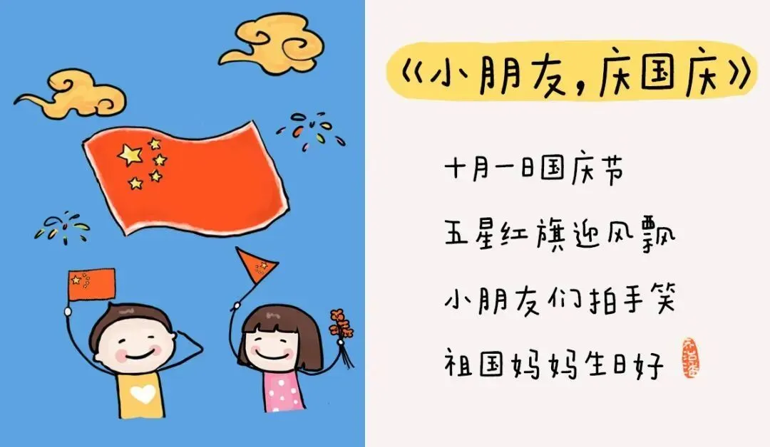 【知识图鉴】漫画:给小朋友的国庆小知识图鉴! 国庆节快到了 在你的假期计划中 有没有一份 给孩子的国庆知识小科普呢 来看看这份给孩子的国庆图鉴吧 爸爸妈妈和老师们 可以跟孩子这样说国庆 一、什么是“国庆节” 1 “国庆”这一词 原指国家喜庆之事 中国古代把皇帝即位、诞辰称为“国庆” 如今称国家建立的纪念日为国庆 2 1949年10月1日 是新中国成立的重大纪念日 至此,每年的十月一号 就成为全国人民隆重庆祝的节日 二、这样回答孩子的问题 三、认识国旗、国徽、国歌 1 国旗旗面为红色,象征革命 旗上的一颗大五角星,四颗小星 表示中国人民围绕着一个中心而团结 象征共产党领导下的革命人民的大团结 2 中华人民共和国国徽 中间是五星照耀下的天安门 周围是谷穗和齿轮 象征着以工人和农民阶级为基础的 人民民主专政的新中国的诞生 3 1978年 经第五届全国人大第一次会议通过 正式将田汉作词、聂耳作曲的《义勇军进行曲》 定为中华人民共和国国歌 四、关于国庆的小儿歌 五、国庆手工小游戏 1 2 3 阅字无数 却最爱“中国” 身为中国人 每个人心中诉不尽对祖国的热爱 身为幼教人 我们的怀里是花朵 背后是祖国 在国庆节到来之际 和孩子们一起祝福亲爱的祖国 生日快乐 编辑:张培娇 初审:陈珍茹 复审:许明理 终审:林美李