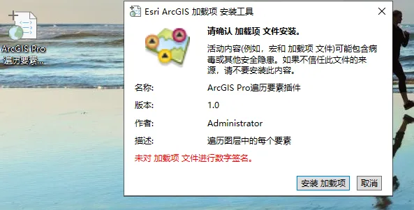 解压下载的文件,双击插件文件「ArcGIS Pro 遍历要素插件.esriAddinX」,在弹出的安装对话框中,点击安装 加载项,即可完成安装。