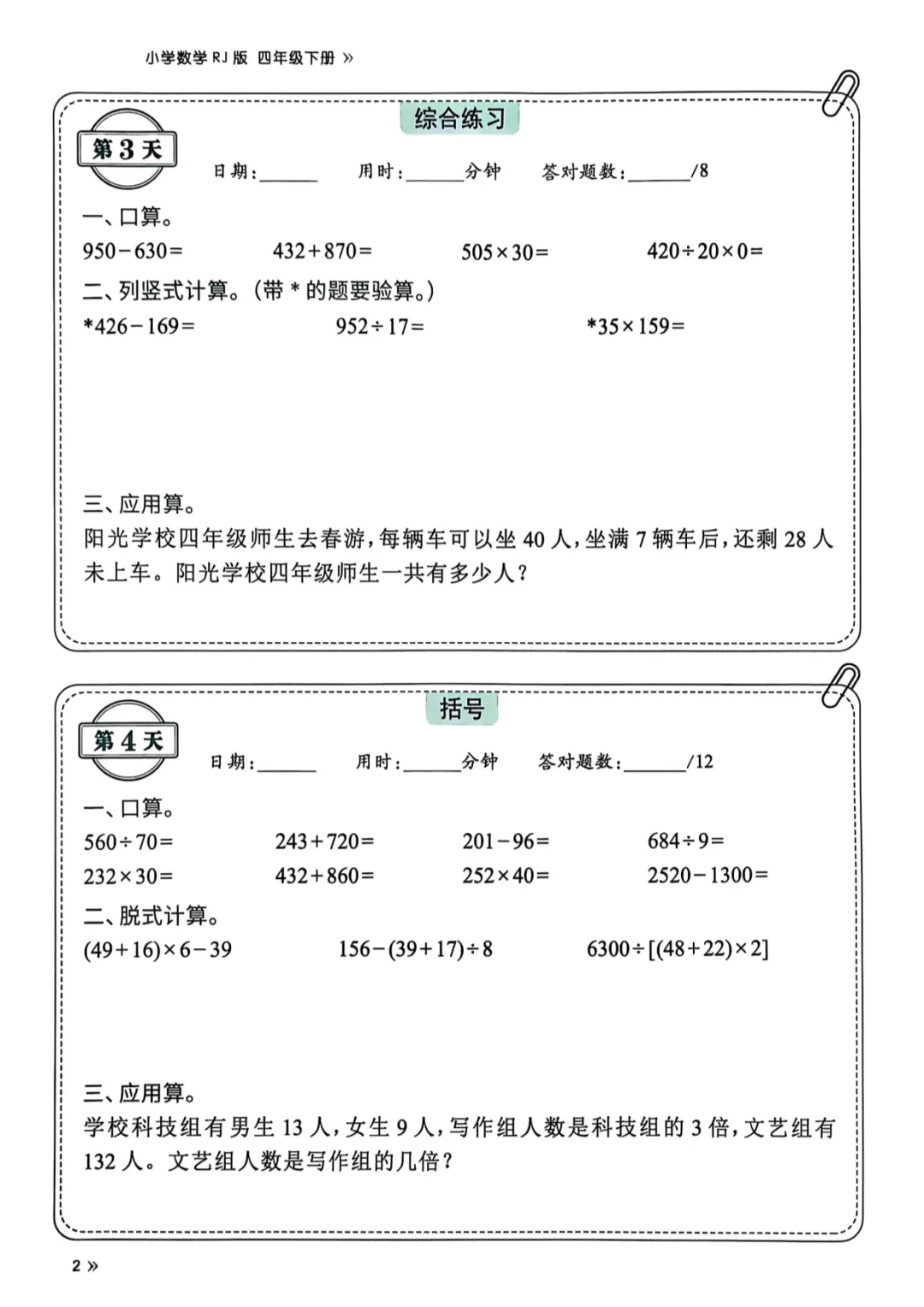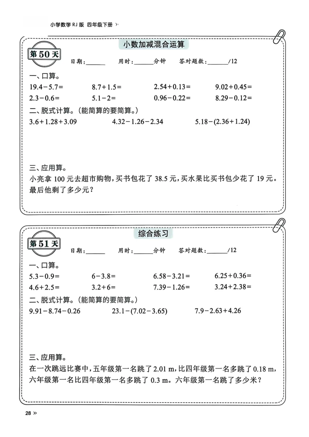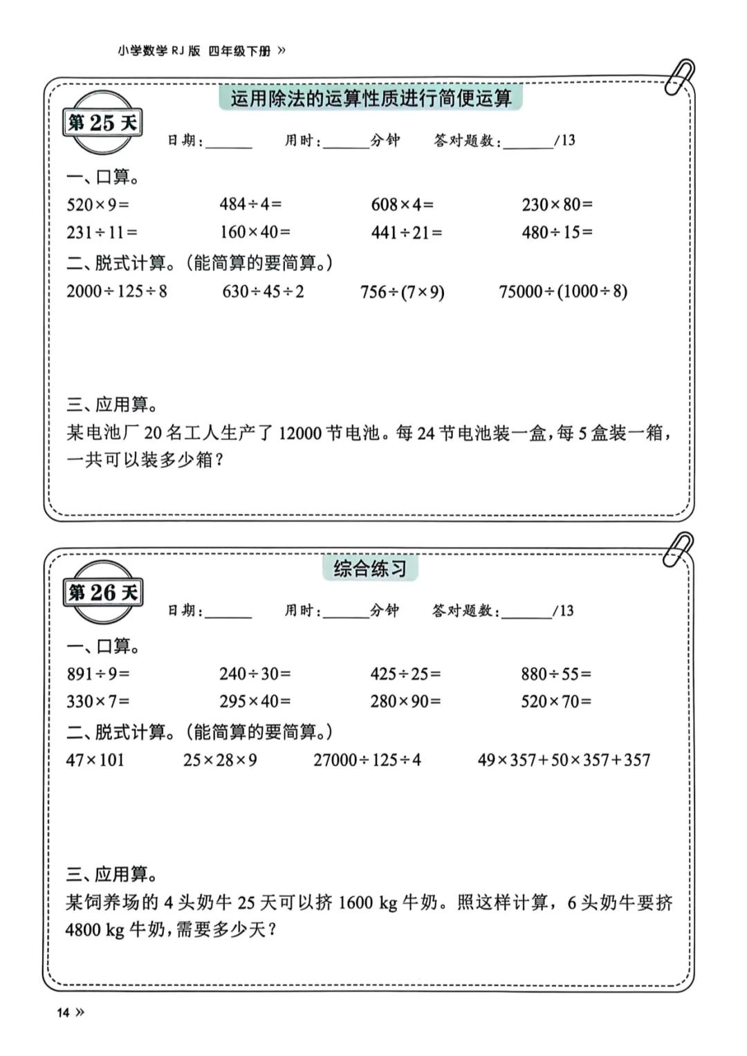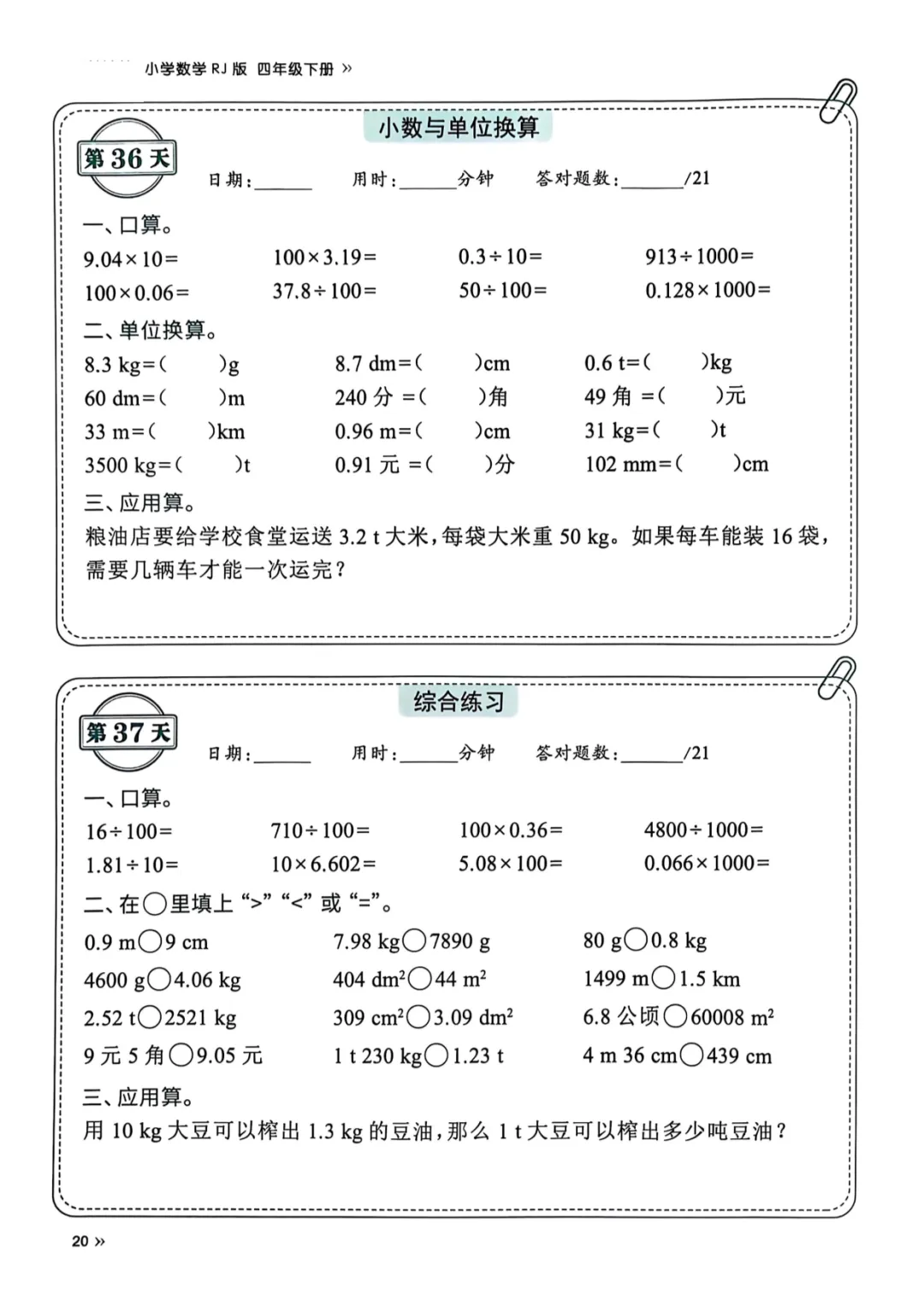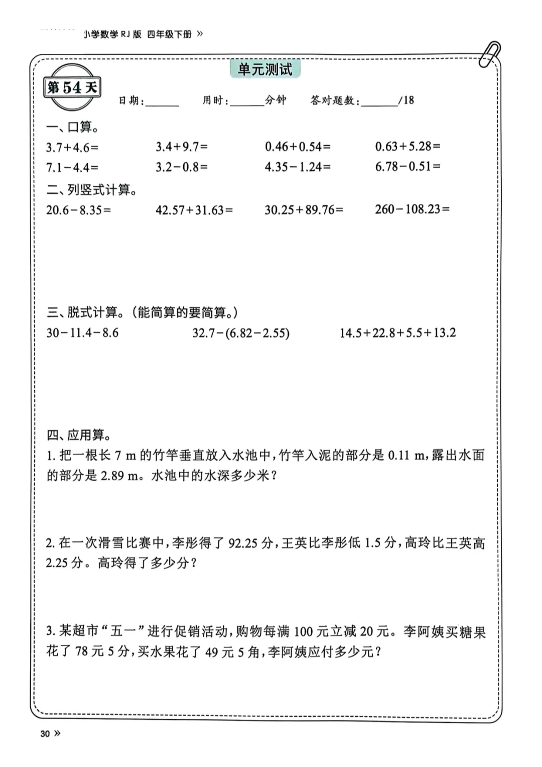 王老师整理了小学四年级下册数学全册同步一课一练,电子版可保存打印~