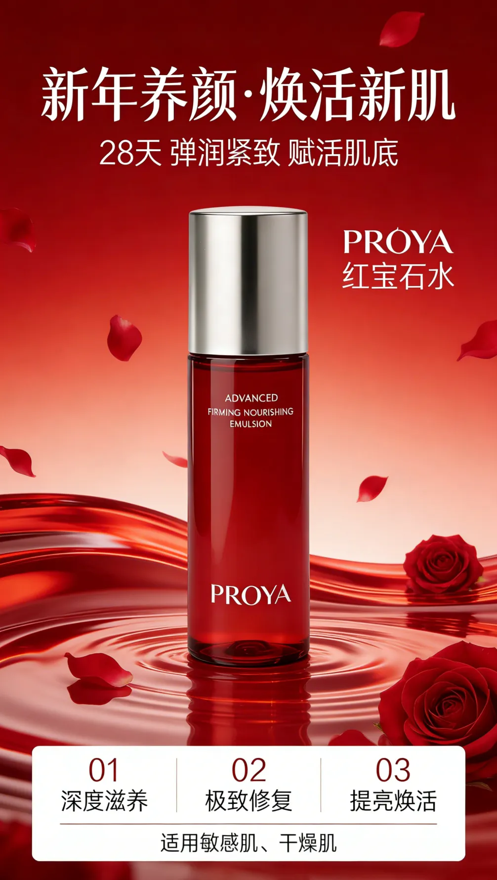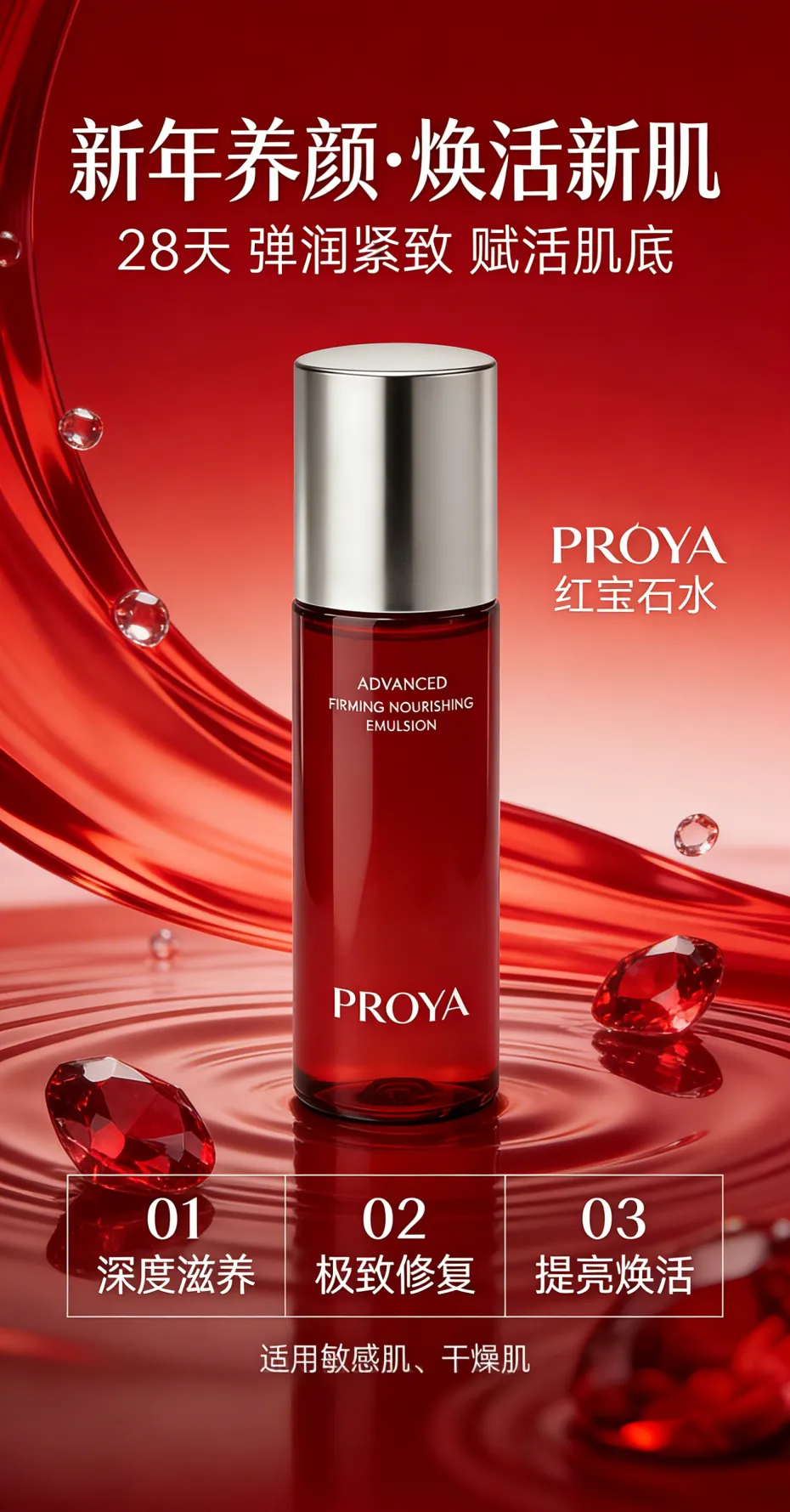 提示词:产品图片+新年养颜·焕活新肌 护肤品海报,红色轻奢风格,主视觉为一瓶红色化妆水瓶。背景为红色渐变,带有流动的红色液体波纹和晶莹剔透的红宝石,虚实结合,营造奢华水润感,顶部有“新年养颜·焕活新肌”大标题,副标题“28天 弹润紧致 赋活肌底”,右侧标注“PROYA 红宝石水”。底部有三个功能模块:01深度滋养、02极致修复、03提亮焕活,底部三个模块下面有一排单独的小字“适用敏感肌、干燥肌”。整体光线柔和,商业摄影质感,8K,高清,适合电商广告。图片比例9:16。