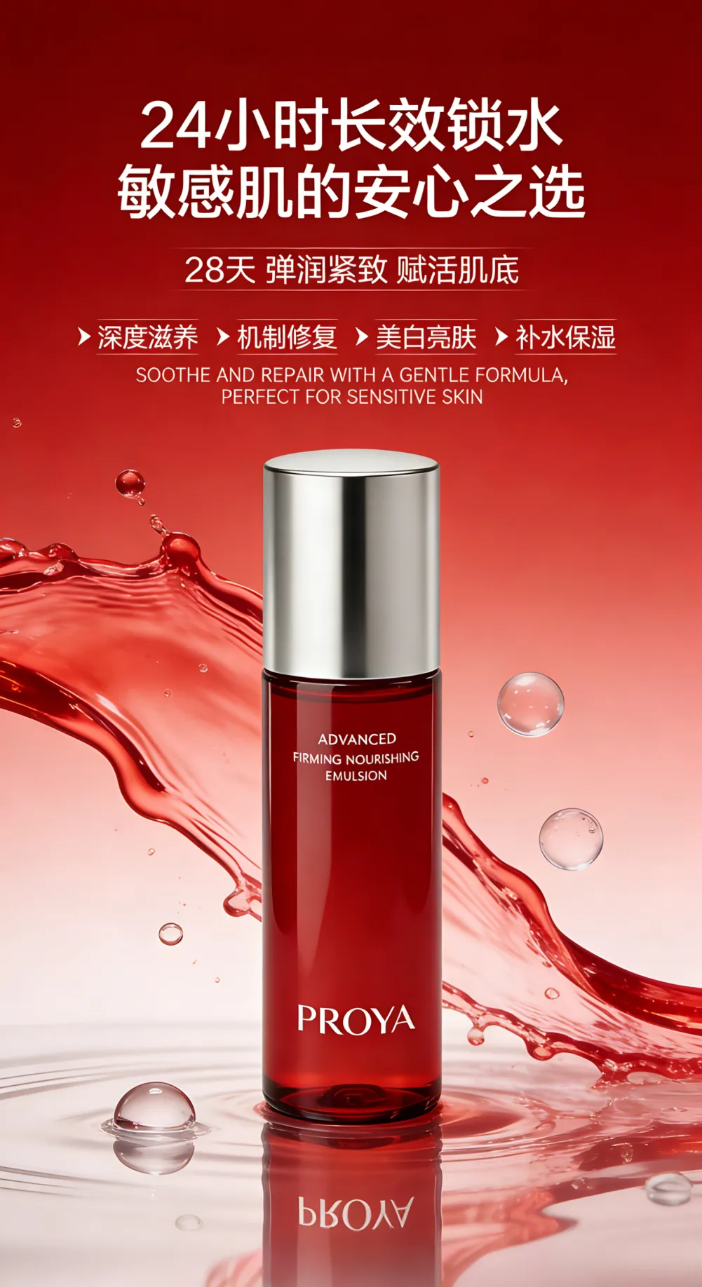 提示词:产品图片+红色轻奢风格护肤品电商海报,竖版9:16比例,主视觉为一瓶红色的护肤品。背景为渐变红色,带有动态的红色液体水花、透明气泡和水滴,水面清晰反射瓶身,营造水润清新、自然高级的质感。 顶部文字:大标题「24小时长效锁水 敏感肌的安心之选」,小字副标题「28天 弹润紧致 赋活肌底」,顶部小字「FEIYU DESIGN SMOOTHS FINE LINES AND FIRMS」。 中部功能模块:四个带箭头的功能标签「深度滋养」「机制修复」「美白亮肤」「补水保湿」,下方英文小字「SOOTHE AND REPAIR WITH A GENTLE FORMULA, PERFECT FOR SENSITIVE SKIN」。 整体光线柔和通透,商业摄影质感,8K高清,自然清新色调,适合电商广告。