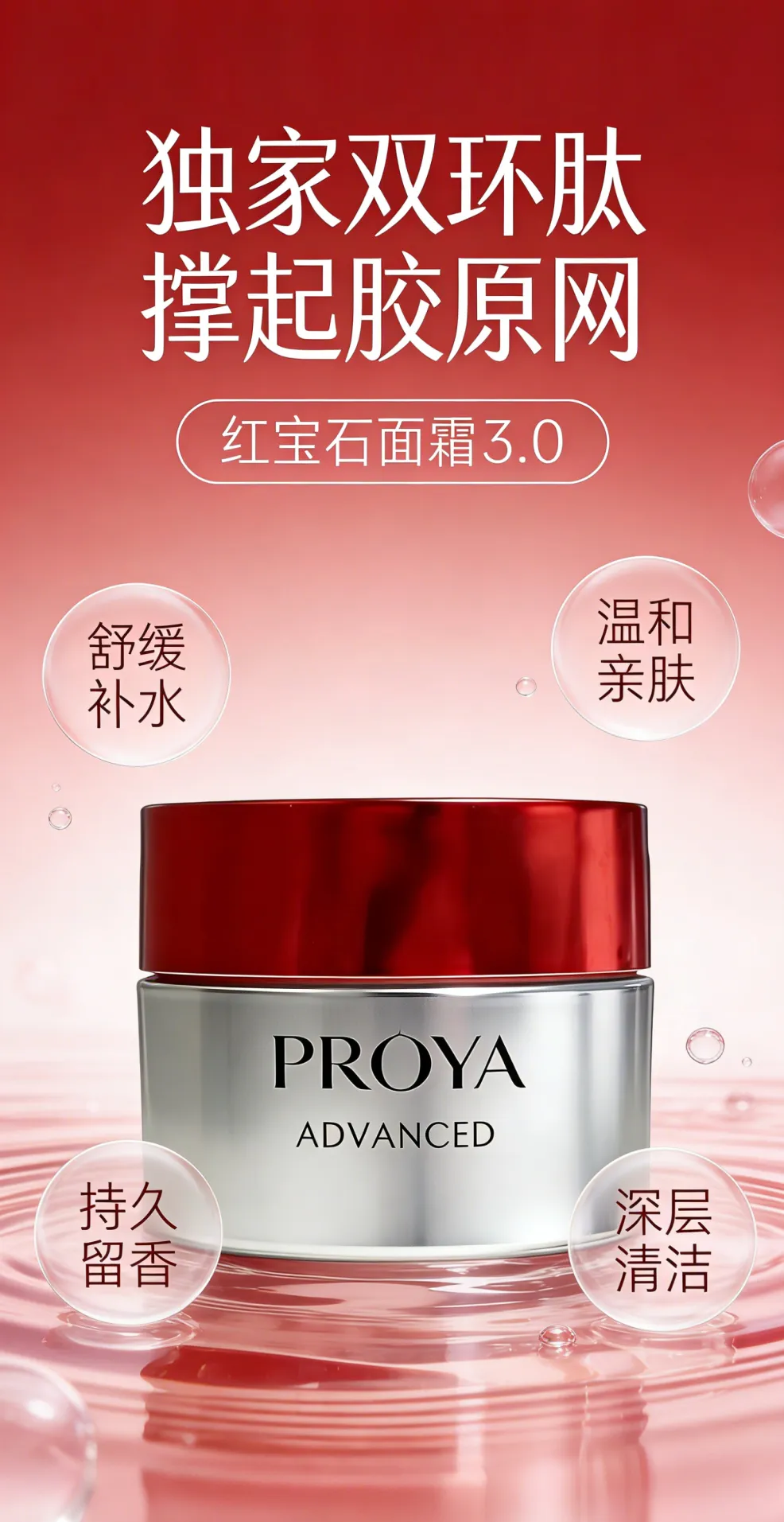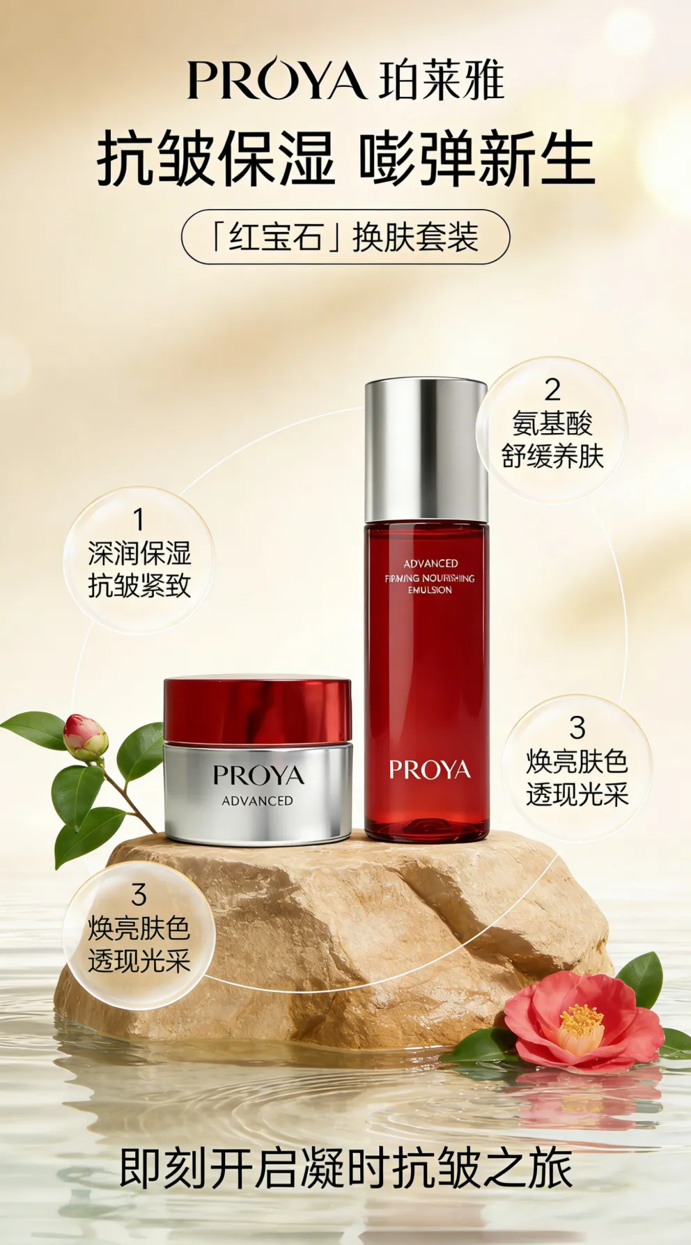 提示词:图片+电商竖版海报,比例9:16,一瓶红色的面霜和一瓶护肤水居中放置在浅棕色岩石上,岩石周围是清澈水面和山茶花、绿色枝叶。背景是纯净的浅米色渐变,带有柔和的自然光影和光斑。 顶部文字:品牌名「PROYA 珀莱雅」,大标题「抗皱保湿 嘭弹新生」,下方圆角标签内文字「「红宝石」换肤套装」。 产品四周环绕三个半透明圆形标签,分别标注「1 深润保湿 抗皱紧致」「2 氨基酸 舒缓养肤」「3 焕亮肤色 透现光采」。 底部文字:「即刻开启凝时抗皱之旅」。 整体风格:自然清新、高级轻奢,商业广告级渲染,柔光氛围,高清晰度,写实质感,干净雅致。