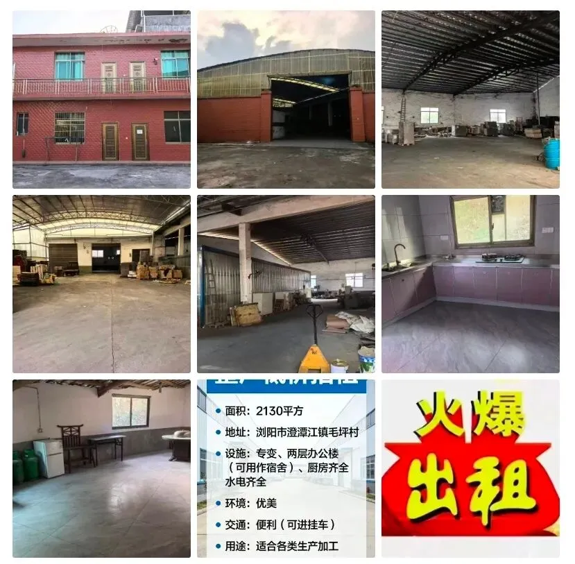 共有2130平方,位于浏阳市澄潭江镇毛坪村,带有专变、办公楼(两层,可用做宿舍)、厨房、水电齐全,环境优美,交通便利(可进挂车),适合用作各类生产加工。