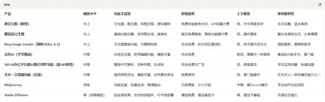 商业设计/电商海报:通义万相(虚拟模特、商用版权)或360 AI办公平台的AI图片创作功能(快速出图)。 -