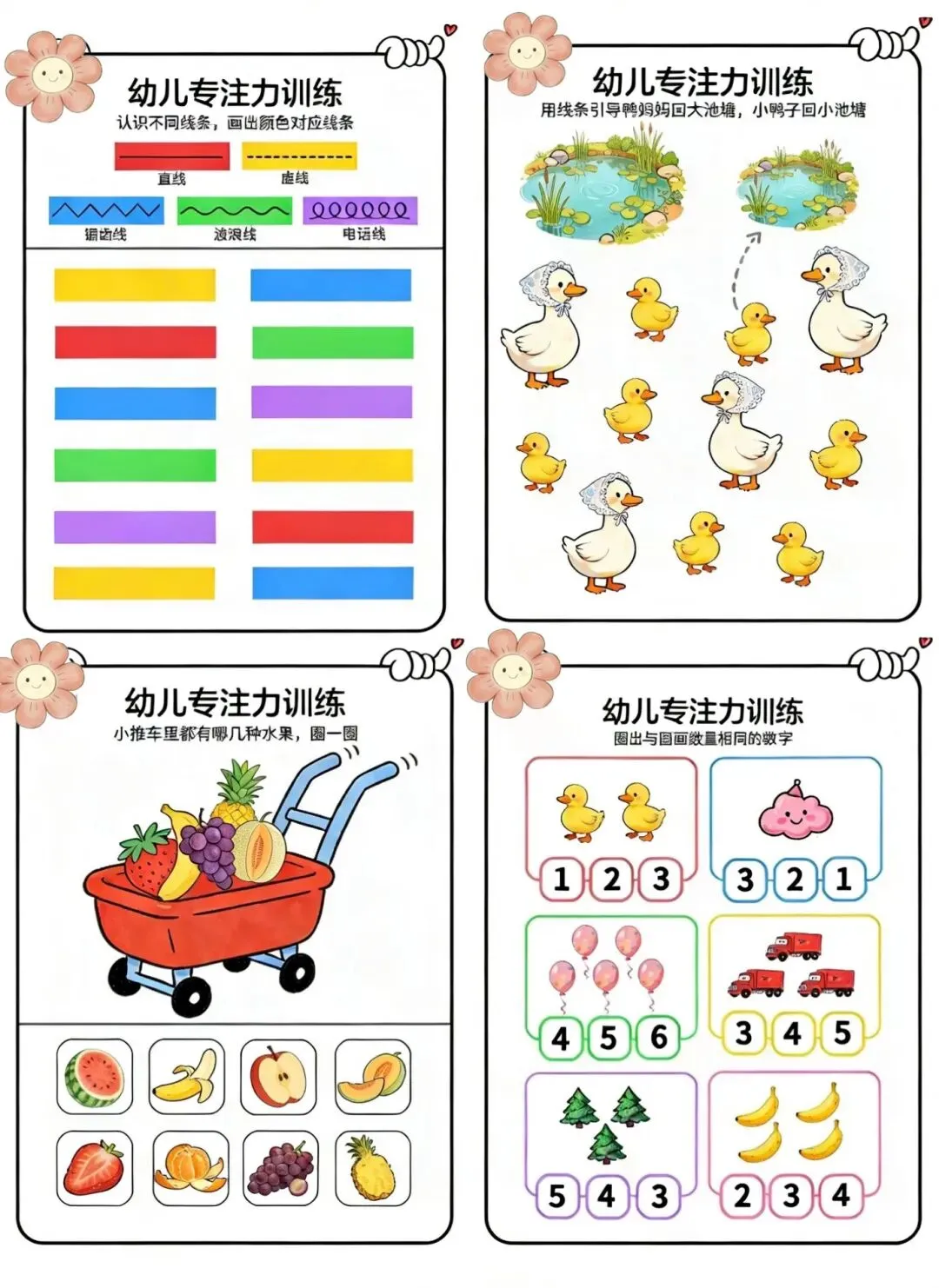 2. 趣味引导:把题目变成“闯关游戏”,比如“帮鸭妈妈找到宝宝”“数一数有几个气球”,让孩子在玩中学习。