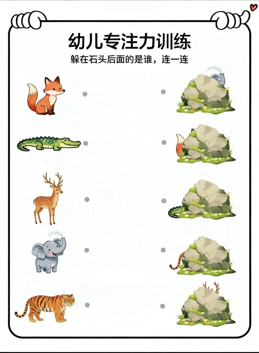 这是一张幼儿专注力训练连线题,主题是“躲在石头后面的是谁”,核心是通过局部特征匹配整体动物,锻炼孩子的观察力和视觉分辨力。
