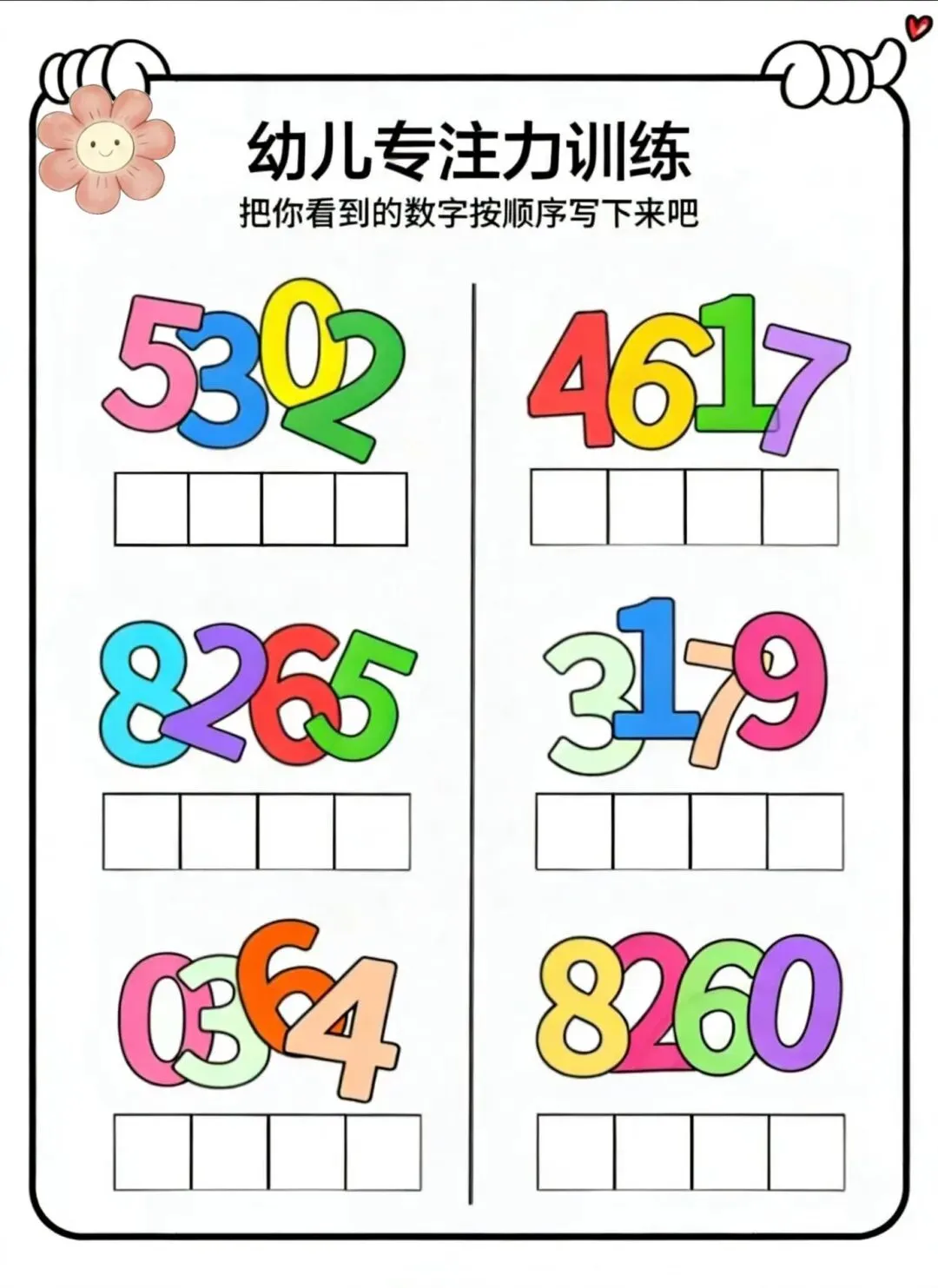 • 可以先让孩子说出看到的数字,再按顺序写下来,降低难度。