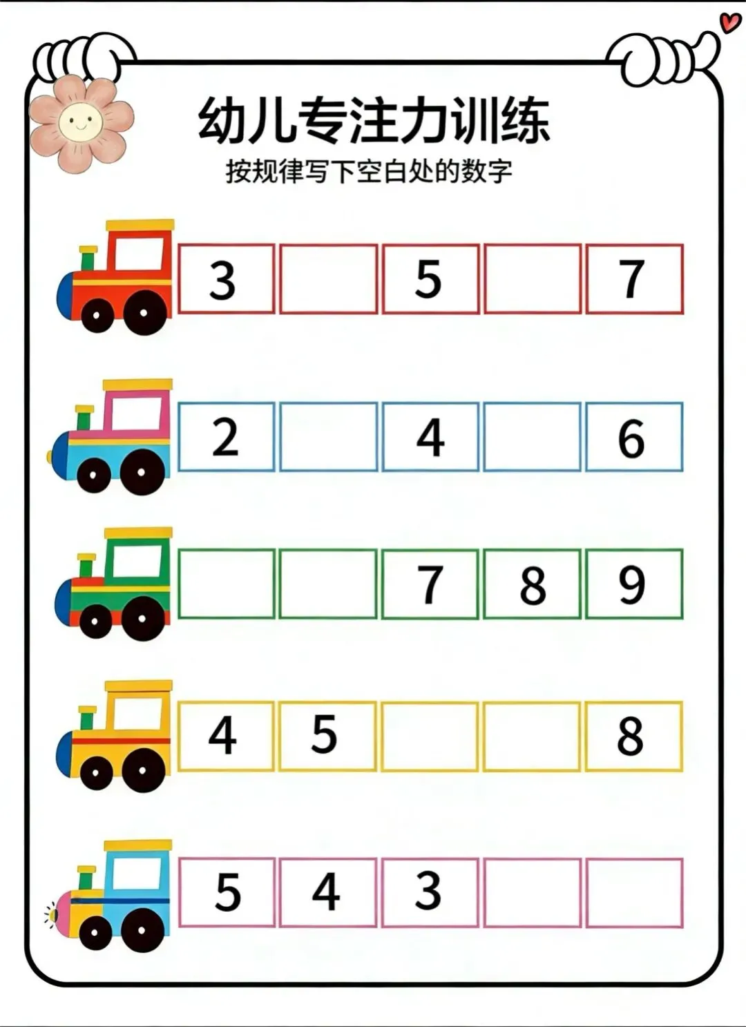 • 正向逆向:除了按顺序填,还可以倒着问孩子“3前面是几?”,锻炼逆向思维。