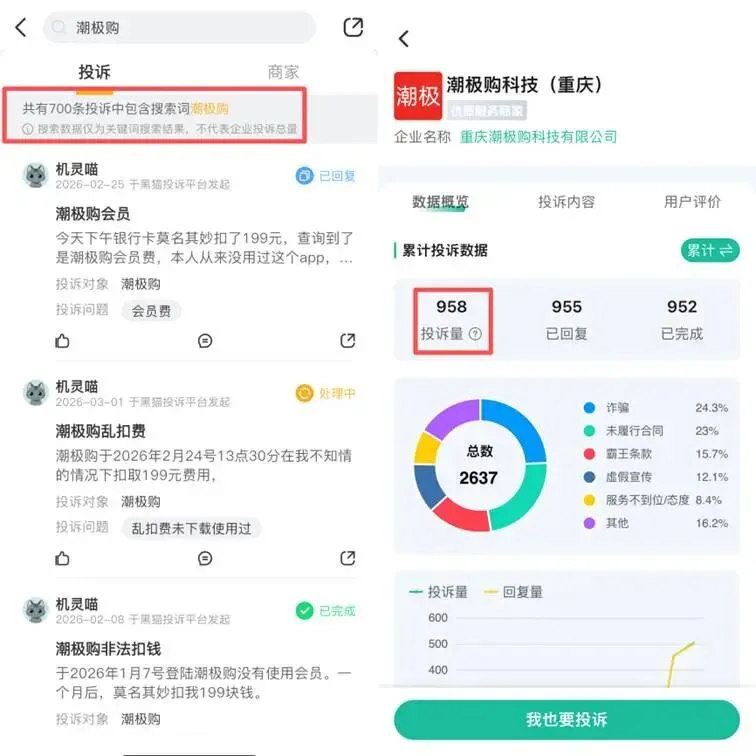 数据显示,在两大投诉平台中,潮极购累计投诉量突破1600起。黑猫投诉平台上,以“潮极购”为搜索词的投诉高达700条,消费保投诉平台中,累计投诉量达958条。“强制扣费”“无故划扣”成为高频投诉关键词。