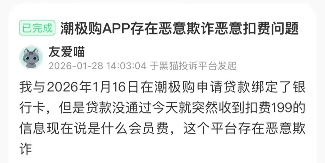 用户投诉显示,2026年1月以来,在潮极购平台申请分期授信、绑定银行卡的流程中,未主动确认开通会员服务,甚至授信申请未获审批的前提下,个人账户仍被划扣会员费,涉嫌恶意违规扣费。