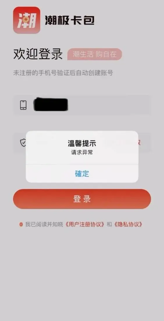 经记者测试,目前,潮极购App已无法正常登录,使用App登录账号时,界面显示为潮极卡包,平台多次弹窗提示“请求异常”。
