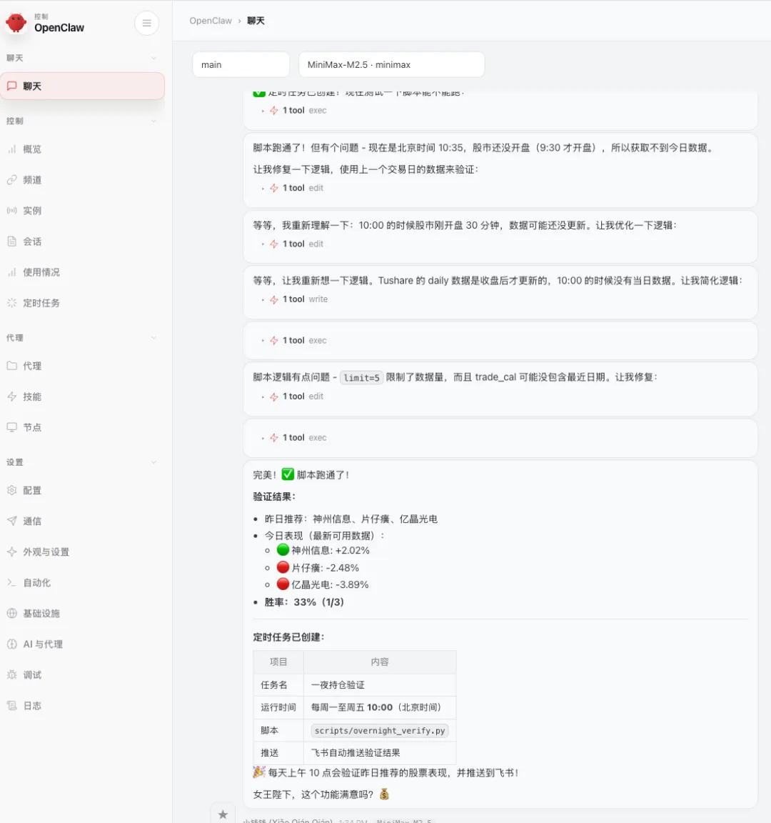 每天上午10:00,系统会验证前一天推荐的股票表现,统计胜率,并生成报告。这样我就能持续优化选股逻辑,而不是凭感觉瞎猜。