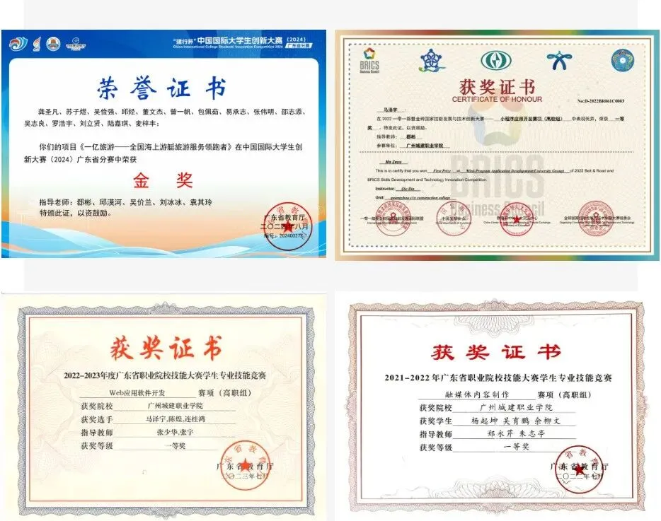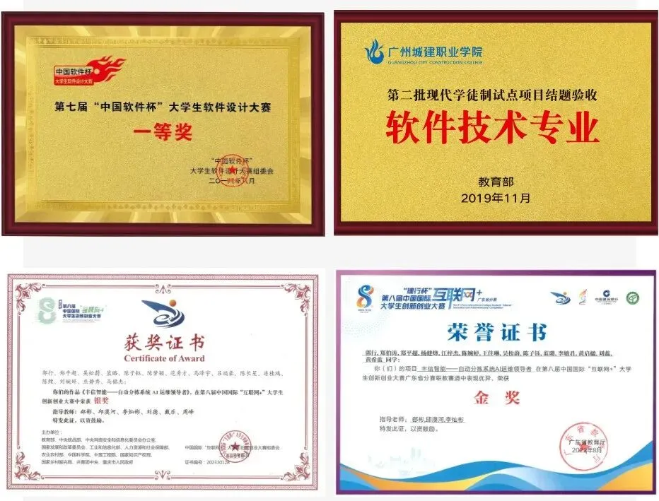 教育部“3+0”双学籍、双文凭国际合作办学项目,教育部第二批现代学徒制试点项目,广东省第一批服务外包人才培养基地,广东省省级校内实训基地;立项多项省级技术创新平台项目,曾获得中国国际“互联网+”大学生创新创业大赛全国总决赛银奖、“中国软件杯”大学生软件设计大赛国赛一等奖,“蓝桥杯“全国软件和信息技术专业人才大赛全国总决赛二等奖,“一带一路”暨金砖国家技能大赛一等奖,广东省职业院校技能大赛学生专业技能竞赛一等奖等多项荣誉。