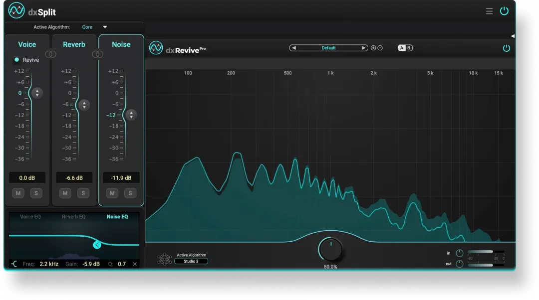 dxSplit 支持在 Voice 通道中直接集成 dxRevive,从而形成更加高效的对白清理与增强工作流程。在完成信号分离后,用户可以在 dxSplit 内部直接加载 dxRevive,对缺失频率进行恢复、减少处理伪影,并获得更加饱满自然的对白表现。