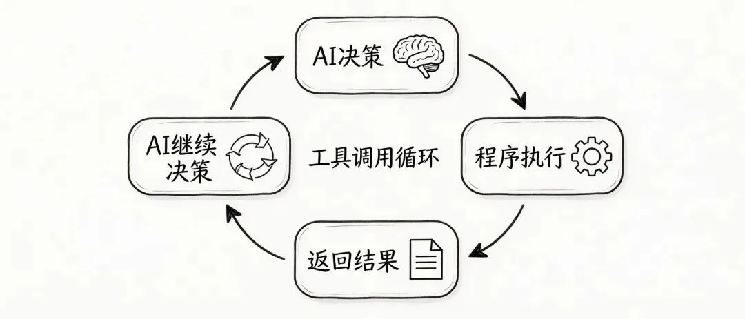 ✅ 这个循环的本质:AI决策 → 程序执行 → 结果返回AI → AI继续决策。AI负责”想”,程序负责”做”。