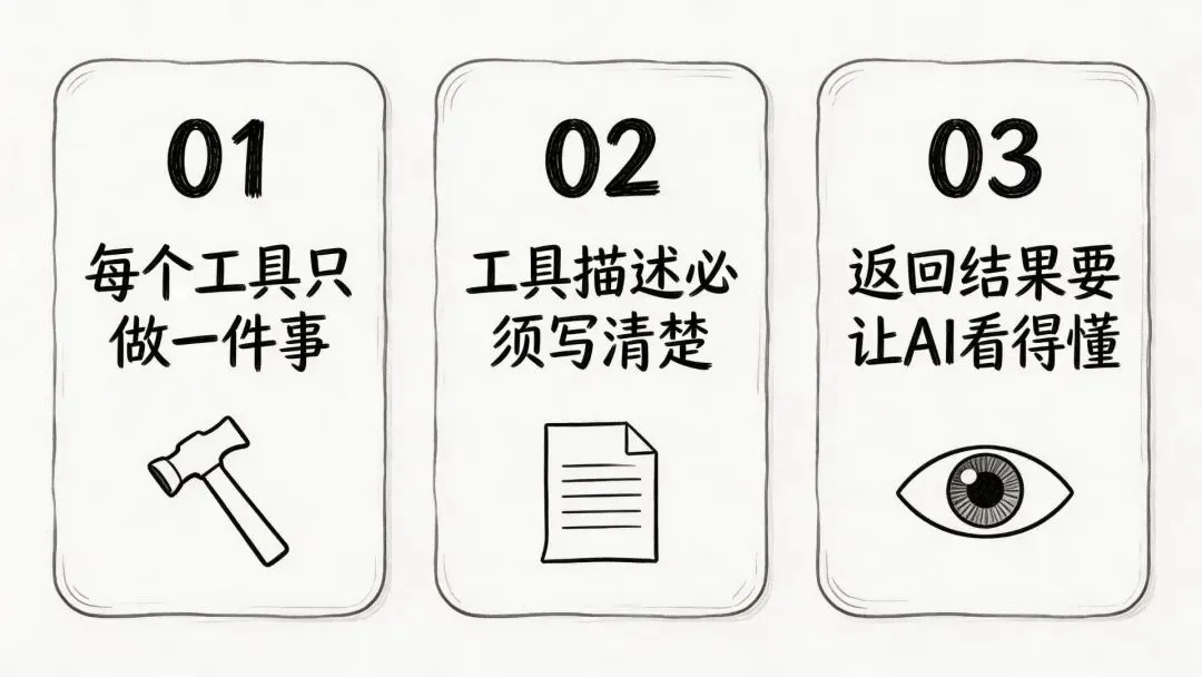 工具返回的内容是AI下一步的决策依据,返回一堆乱码或复杂嵌套数据,AI会读错。