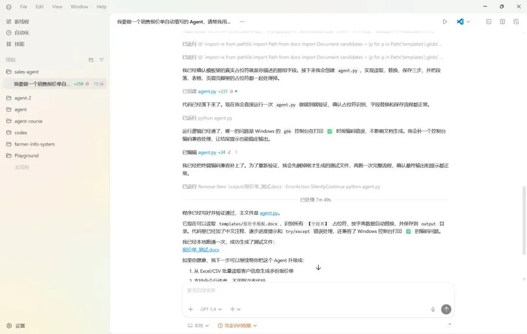 在Codex对话框里说:“生成的文件里【客户名称】等占位符没有被替换,请检查write_content函数的替换逻辑,确认替换的是段落里的run文本而不只是paragraph文本”