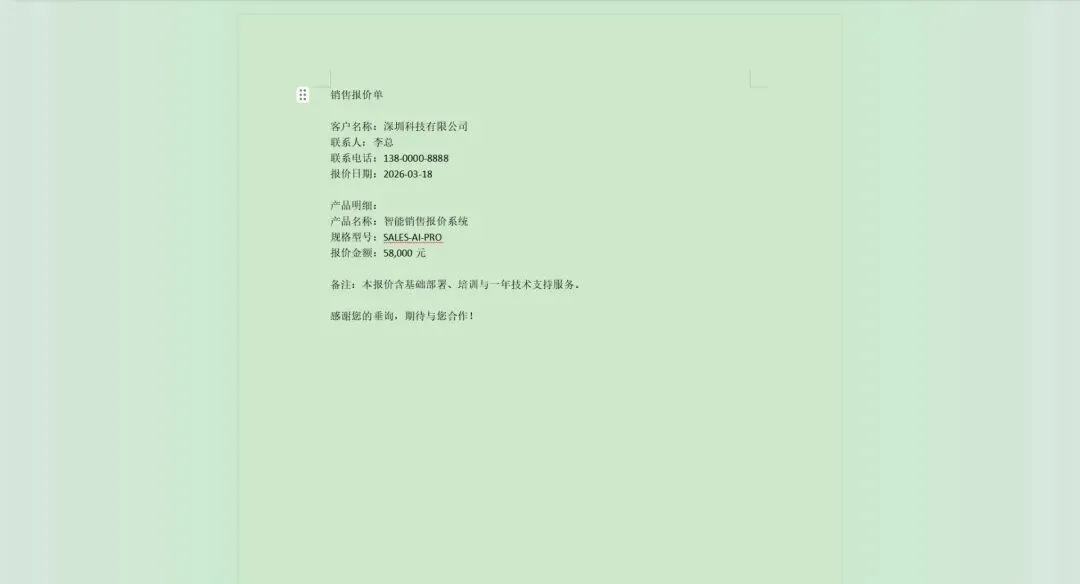 你说:“帮我把这份报价单模板填好,客户是深圳科技有限公司,联系人李总,报价58000元”