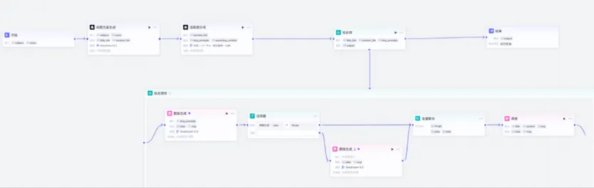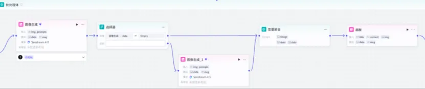批处理节点内依次添加图像生成 1、判断器、图像生成 2、变量聚合、画板节点,