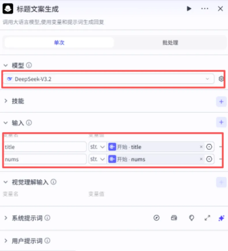 新增大模型节点并命名 “标题文案生成”,