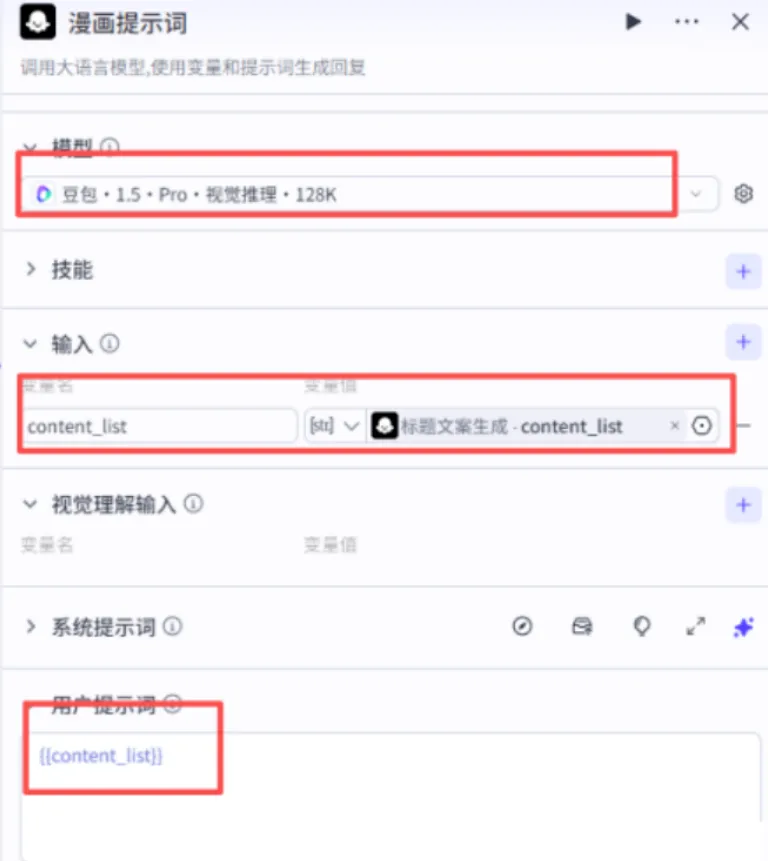 第三步:再添大模型节点,文案转漫画提示词