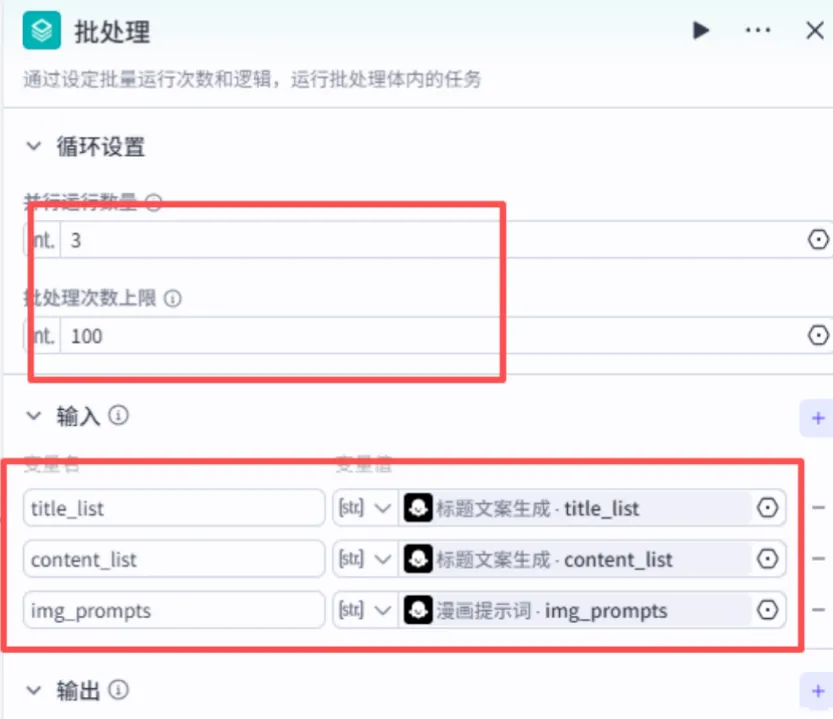 ●输出设置:添加 title_list(标题列表)、content_list(文案列表)两个变量