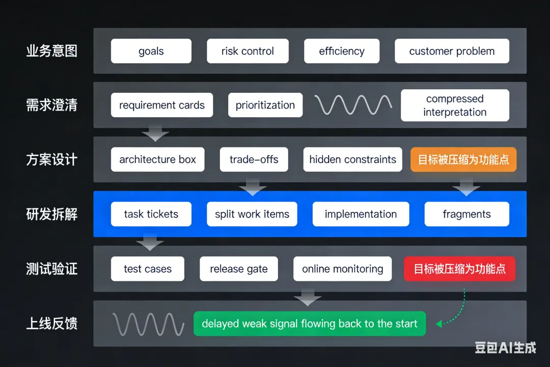 一个业务诉求,从最初被提出,到最后变成一个线上系统,中间会经过很多层翻译。业务讲的是目标,产品把它整理成需求,研发再把它拆成方案、接口、任务和实现,测试再去理解它的风险边界,最后上线以后,线上反馈再回流到下一轮迭代。链路越长,参与方越多,信息损失就越大。