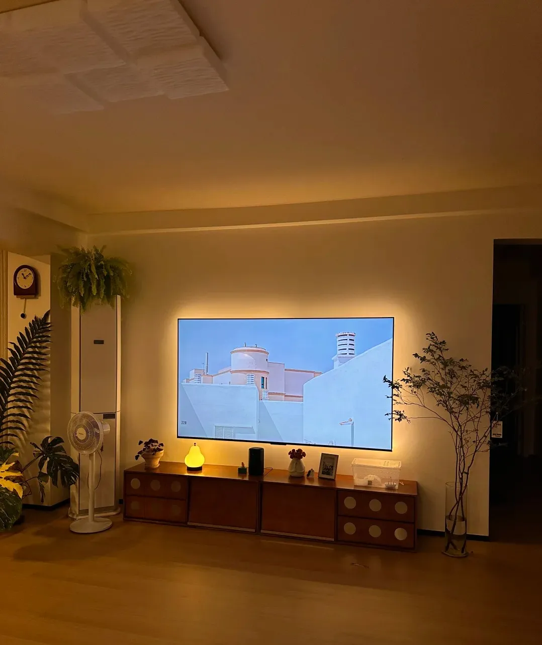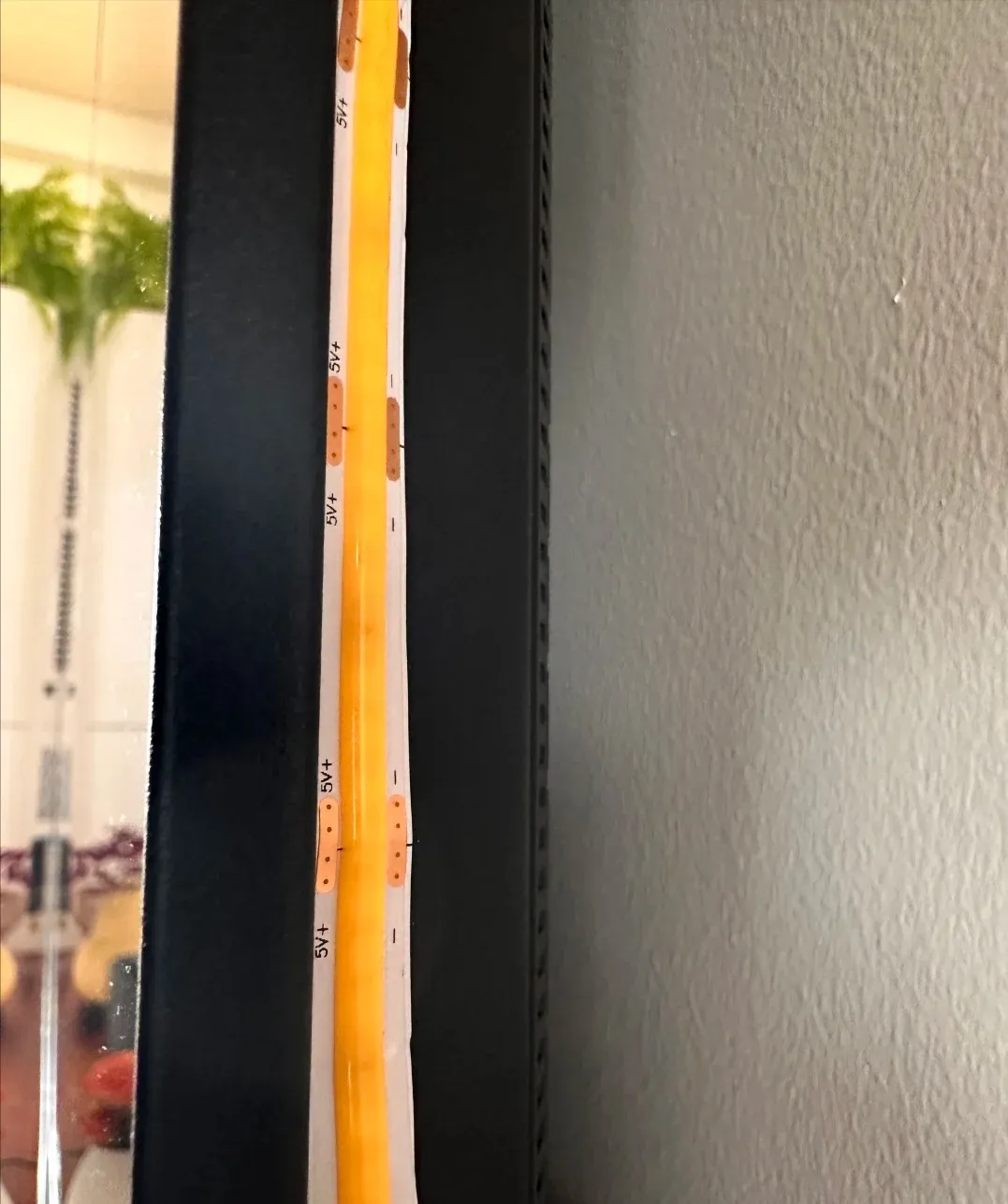 有一次在邻居家蹭饭,晚上电视一开起来,背后那道柔和的暖光就亮了。整个客厅一下子变得高级了起来,并没有灯珠闪烁的感觉,也不像装修用过的灯光槽那么隆重。回家后对比了一下天花板上的主灯就很刺眼像是监考一样后来问她型号才知道COB灯带和廉价珠灯出光差别很大。直接把灯带贴到电视后面去,插上USB口之后打开电视的时候就会自动亮起,并且关掉电视的时候就熄灭了。模仿做了一根,在装修时没有留好位置,于是就把灯光槽补齐了。