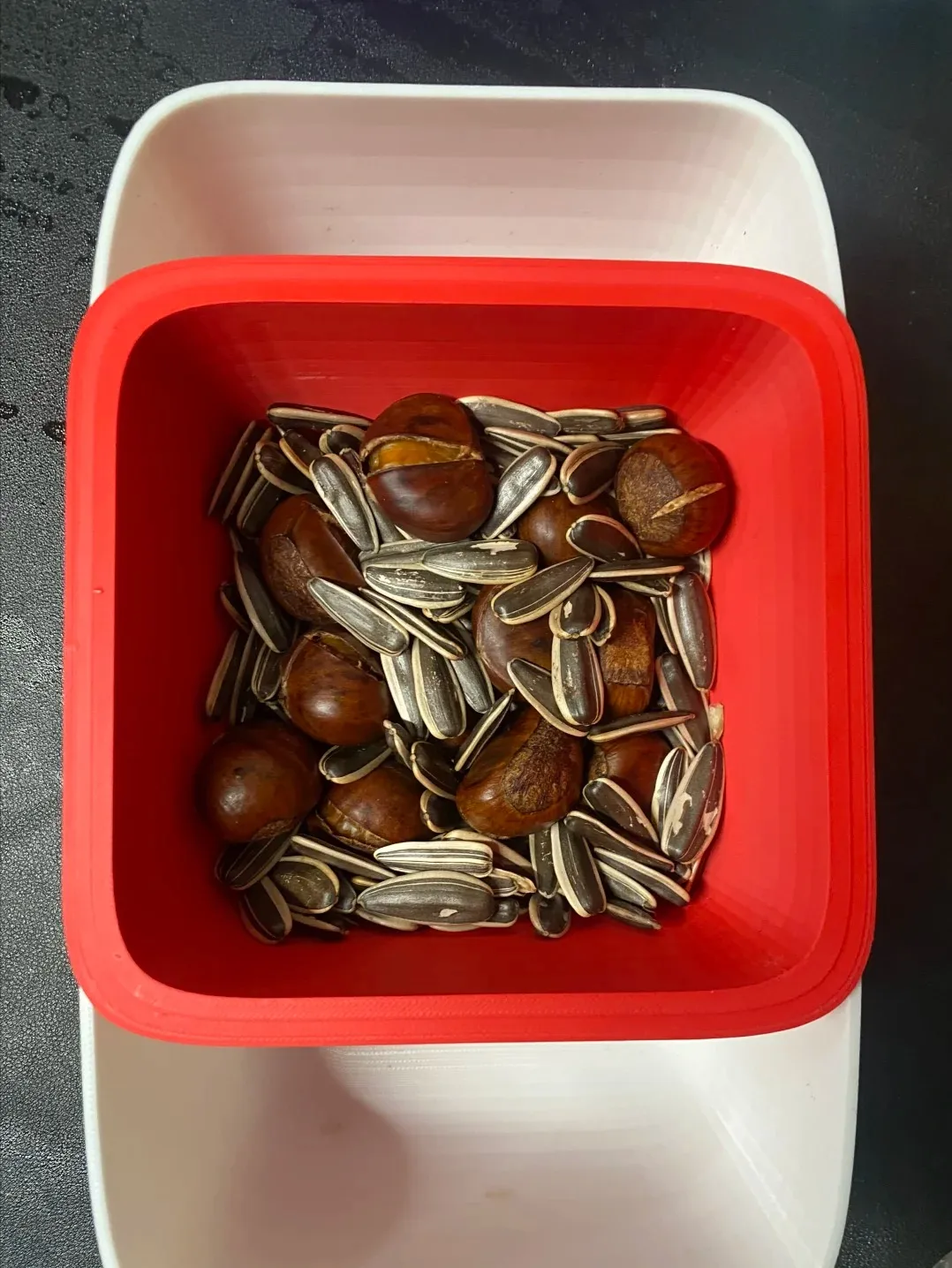 春节的时候一家人一起看电视剧,桌子上放的零食和瓜子壳很快就被混在一起了。去年真的被“桌布全是壳”搞崩了之后今年就换成了分层瓜子盒。有一次爸爸吃瓜子时手上沾水还要翻垃圾袋,这次直接单手把壳扔到地上,一气呵成省了一半的时间和力气。波浪开口的结构如果不接触的话是看不到人情味儿的,再大的果壳也不怕到处都是。比起大碗一层的那种或者临时用塑料袋装的情况要高级很多。