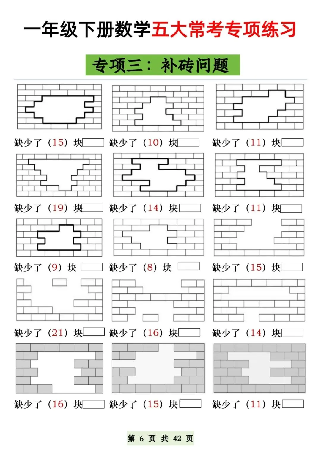 这份一年级下册数学五大常考专项练习【可下载可打印】完整电子版共42页