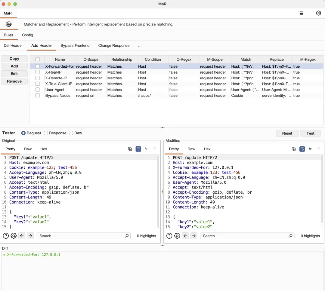 MaR的设计思想来源于BurpSuite原生的Match and Replace功能,但提供了更加灵活和强大的规则配置能力,支持条件匹配、正则表达式、多作用域等高级特性。