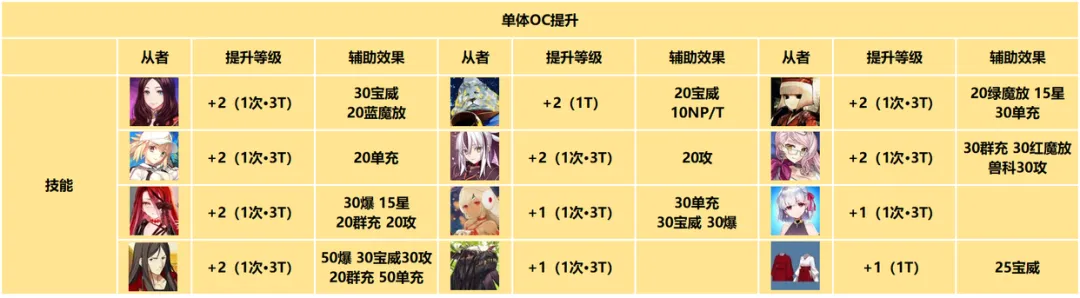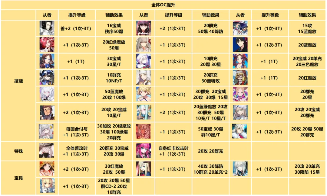 以上是能够提升全体OC等级的从者,从10周年开始计算,到目前为止一共实装或强化了9位。
