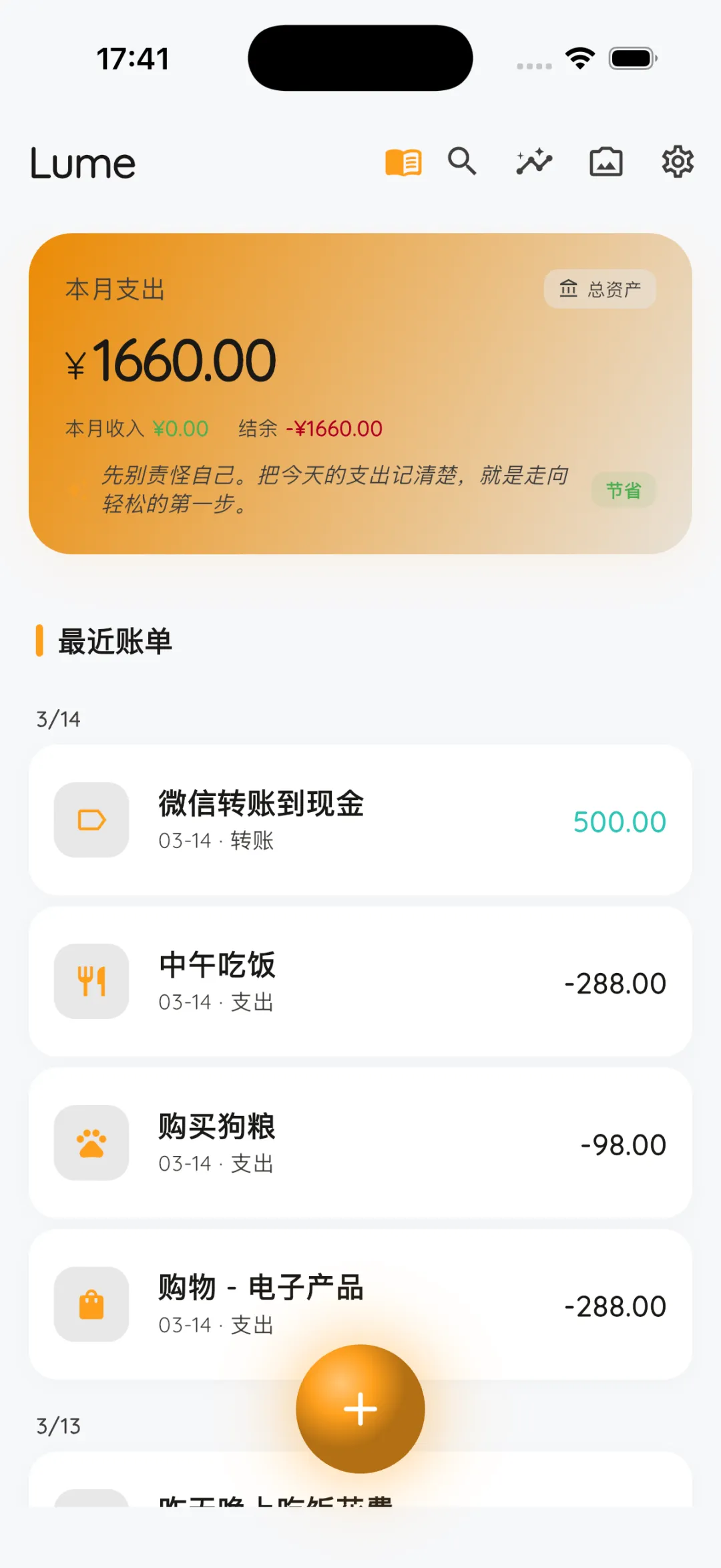 看到卡片底下的那行字了吗?那是 Lume 内置的 AI 根据你今天的消费习惯,每天给你写的一句“财务叙事”。有时候你超支了,它会温柔地提醒你;像今天,它告诉我:“先别责怪自己。把今天的支出记清楚,就是走向轻松的第一步。”