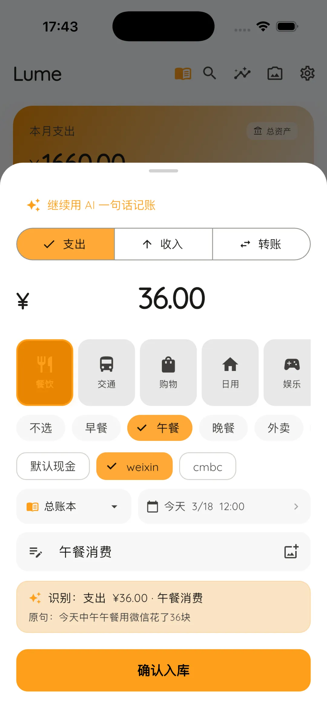 上面这个账单就是 单击Lume,输入的原句是“今天中午午餐用微信花了36块 ”,于是AI识别了“今天”“午餐”“36元”“微信” 4个关键输入点,涵盖了时间、一级+二级分类、金额、支付方式。你直接点击确认入库就可以轻松完成这一笔记账。
