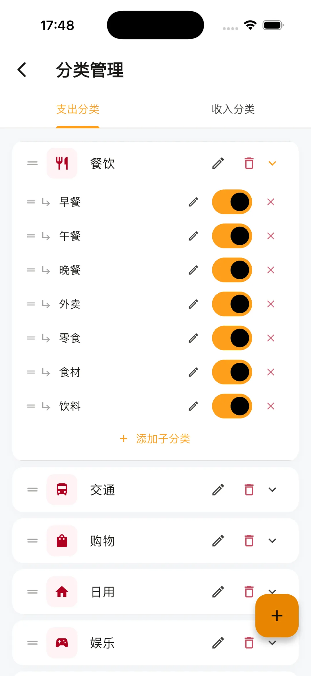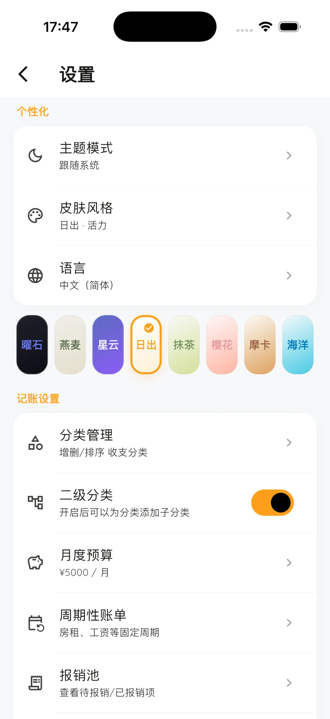 看到中间那个**“二级分类”的开关**了吗?如果你觉得记账分得太细纯属徒增烦恼,你只要把它关掉,整个 App 里的二级分类就会瞬间隐藏。再也不用纠结刚才喝的那杯瑞幸到底是属于“餐饮”还是“饮料”了。你的记账本,就该按你的规矩来。