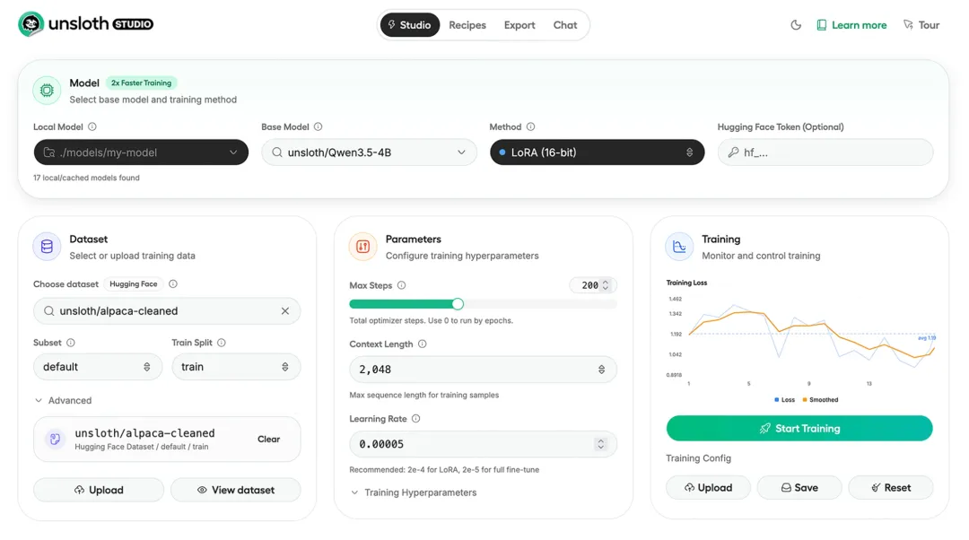 Unsloth部署好后,页面长这样: