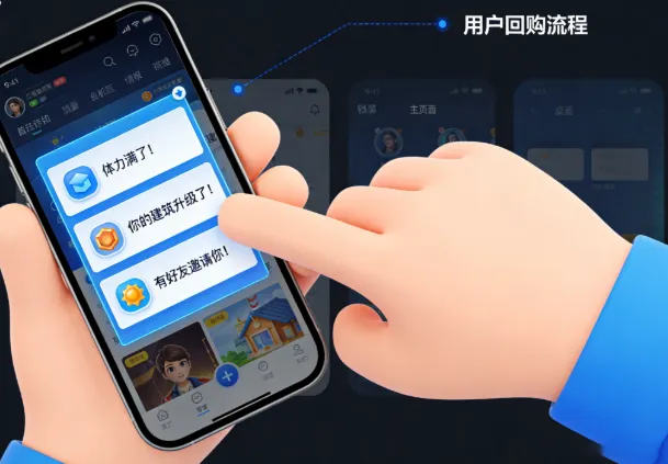 “体力满了!”“你的建筑升级了!”“有好友邀请你!”用户看到通知,点一下,回到游戏。这是典型的被动唤醒,依赖的是手机的锁屏通知和桌面图标。这也是App游戏用户召回的常规手段。