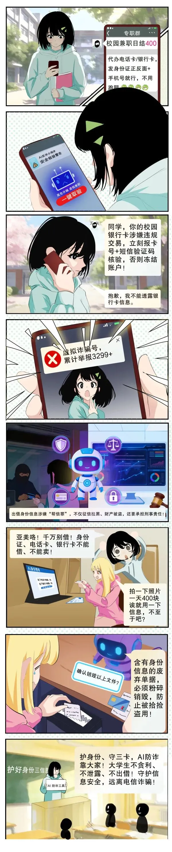 陌生来电不轻信,未知链接不点击,个人信息不透露,转账汇款多核实。电话卡、银行卡、身份证绝不外借、不出售,别因小利触犯法律。诈骗手段层出不穷,守住底线、提高警惕,保护好自己的财产与征信,远离骗局,平安校园你我共守护。
