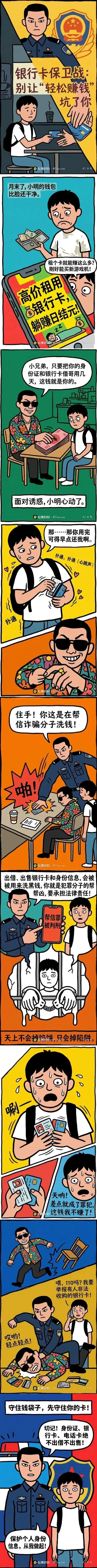 电话卡、银行卡、身份证,是你的身份凭证,也可能成为诈骗工具。出借、出售“两卡一证”,轻则征信受损,重则涉嫌帮信犯罪。别因小利出卖信息,守护好个人证件与账户,就是守住自己的人生底线。