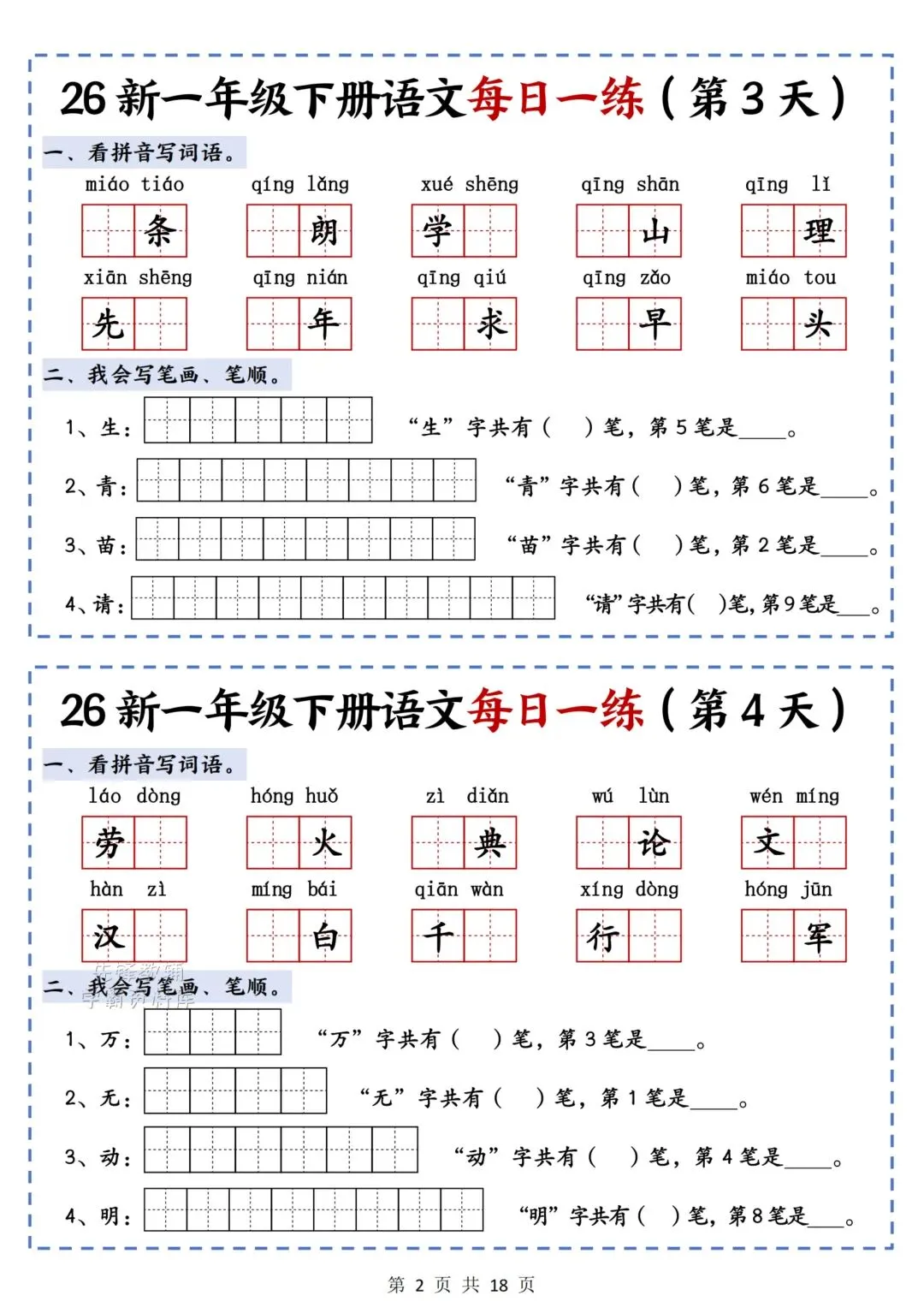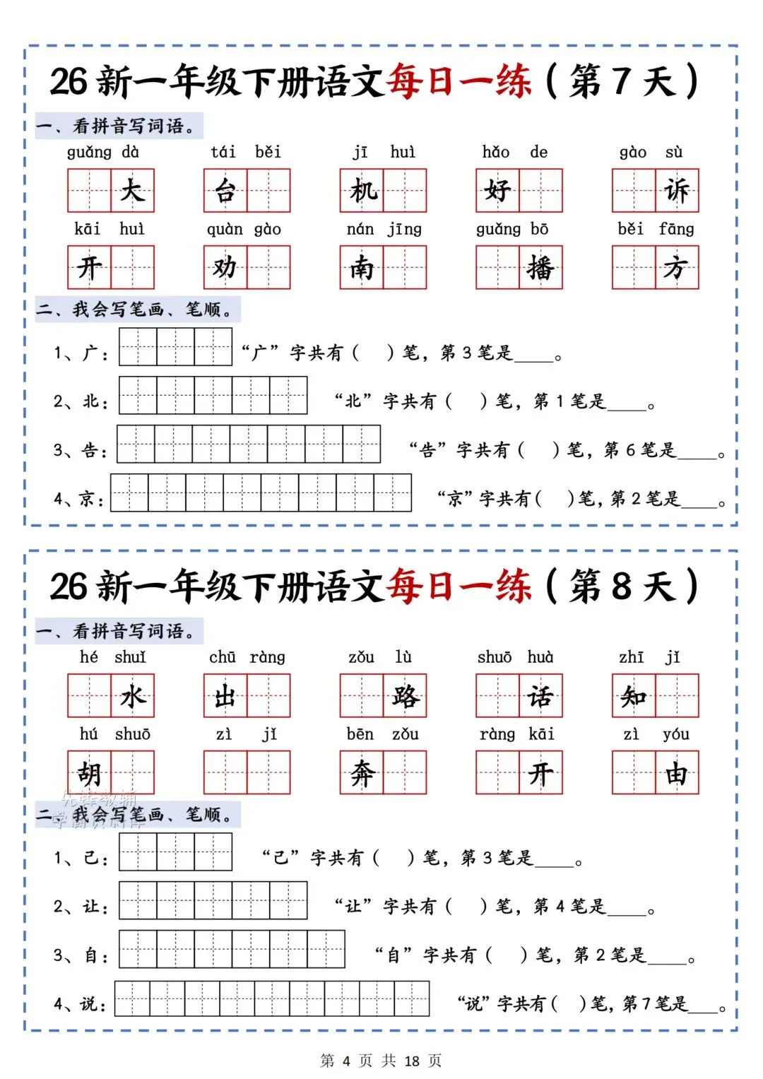 2026春最新版《一年级语文下册每日一练》电子版可打印
