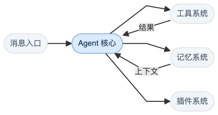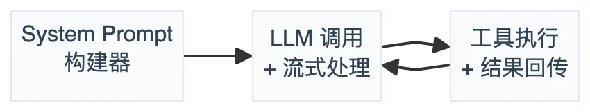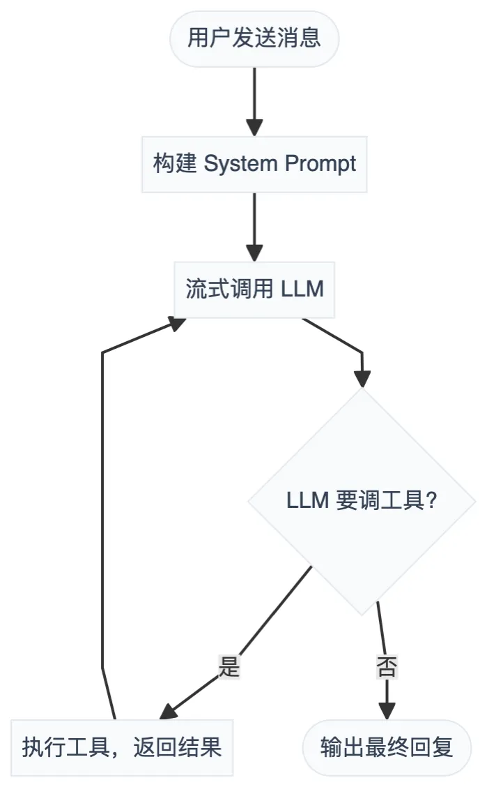 LLM 决定要不要调工具,调了就把结果喂回去,来回循环,直到 LLM 觉得可以直接回复了。这个”工具循环”是所有 Agent 框架的共同骨架。