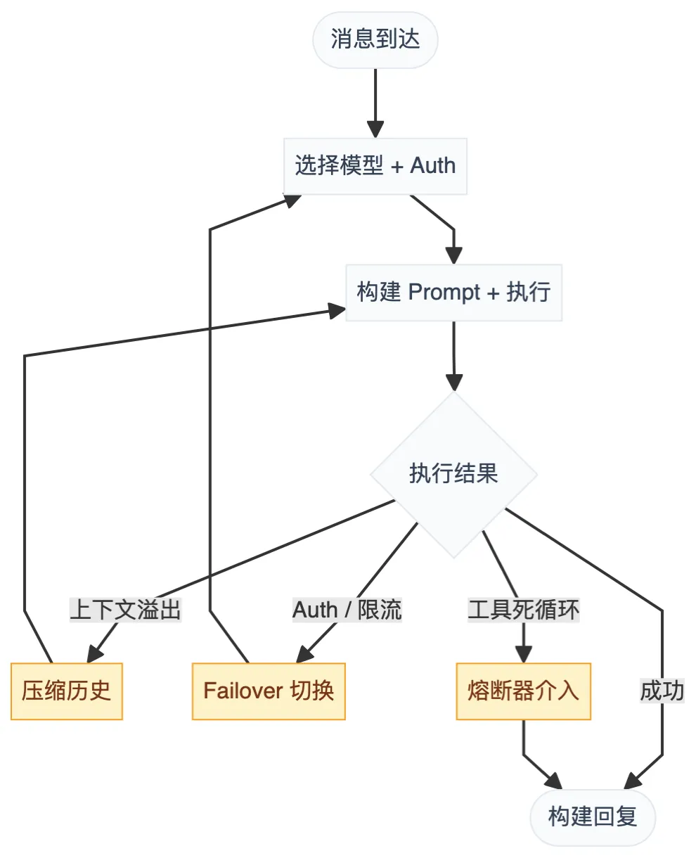 很多教程里的 Agent 就是一个 while 循环加一次 LLM 调用。但真跑在线上的 Agent,得处理网络抖动、API 限流、上下文爆掉、工具死循环这些破事。OpenClaw 的核心入口在 src/agents/pi-embedded-runner/run.ts。