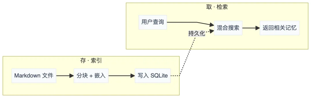 为什么不用向量数据库服务? 单用户或小团队的 Agent,SQLite 够了。一个 .sqlite 文件就是全部记忆,拷到另一台机器就能跑。等真需要多租户、分布式检索的时候再迁移不迟。