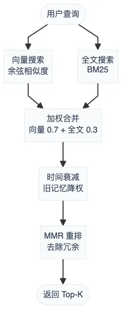 纯向量搜索擅长语义匹配(”怎么部署”能匹配到”上线流程”),但会漏掉精确关键词;纯全文搜索反过来。OpenClaw 把两者拼在一起,再加上时间衰减和去重排序,形成四步检索管线: