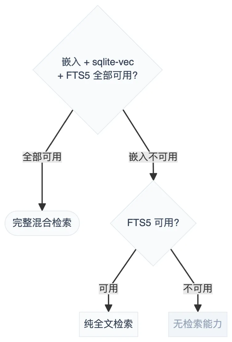 降级策略:嵌入挂了用 FTS,FTS 也挂了就不检索,但 Agent 本身不能挂